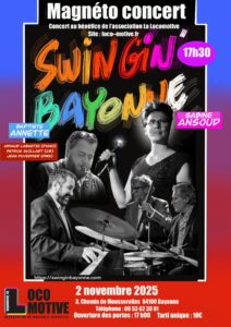 Le Swingin’ Bayonne en concert solidaire au Magnéto à Bayonne avec Sabine Ansoud (voc) et Baptiste Annette (ts)